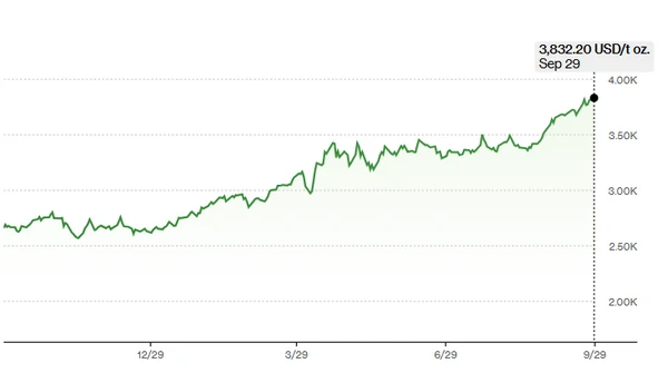 Цены на золото впервые превысили 3 800 долларов за унцию. Повышение связано с ростом ожиданий снижения ставок Федеральной резервной системы США, что ослабило доллар. Об этом сообщает Reuters. Опасения по поводу возможного шатдауна правительства США также усилили спрос на безопасные активы. Динамика рынкаСпотовая цена золота выросла на 1,4% до 3 812,49 долларов за унцию. Фьючерсы на золото с поставкой в декабре подорожали на 0,9% до 3 842,20 долларов.