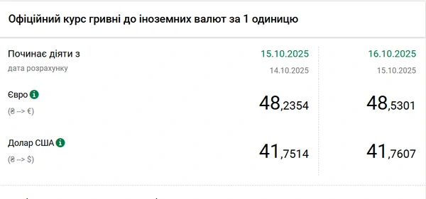 Национальный банк Украины (НБУ) повысил курс доллара к гривне. Доллар дорожает шестой день подряд с 9 октября. Об этом сообщает РБК-Украина со ссылкой на данные на сайте регулятора. Официальный курс на 16 октября 2025 года установлен на таком уровне: 41,7607 гривен за 1 доллар (+0,0093 грн). Выше был курс только 5 августа - 41,7901. Официальный курс евро составит 48,5301 гривен за 1 евро (+0,2947 грн).