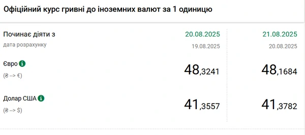 Национальный банк Украины (НБУ) повысил курс доллара к гривне. Доллар дорожает второй день подряд падения до минимума с начала апреля. Об этом сообщает РБК-Украина со ссылкой на данные на сайте регулятора. Официальный курс на 21 августа 2025 года установлен на таком уровне: 41,3782 гривен за 1 доллар (+0,0225 грн). Официальный курс евро составит 48,1684 гривен за 1 евро (-0,1557 грн).