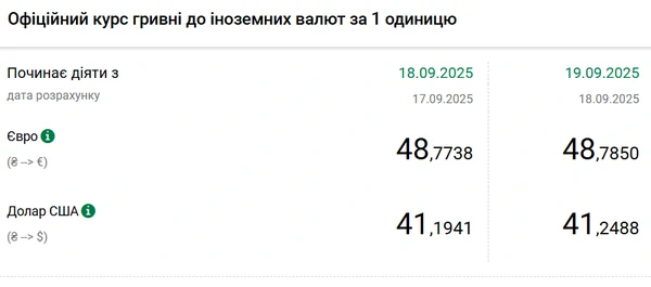 Национальный банк Украины (НБУ) повысил курс доллара к гривне. Доллар дорожает второй день подряд. Об этом сообщает РБК-Украина со ссылкой на данные на сайте регулятора. Официальный курс на 19 сентября 2025 года установлен на таком уровне: 41,2488 гривен за 1 доллар (+0,0547 грн). Официальный курс евро составит 48,785 гривен за 1 евро (+0,0112 грн).