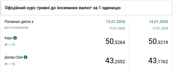 Национальный банк Украины установил на среду, 14 января, официальный курс доллара к гривне на уровне 43,18 гривны за доллар, таким образом украинская валюта укрепилась на 8 копеек. Согласно данным на сайте регулятора, по отношению к евро гривна также укрепила позиции: официальный курс европейской валюты на среду установлен на уровне 50,32 гривны за один евро, то есть гривна выросла на 21 копейку. На межбанковском валютном рынке Украины котировки гривны к доллару установились на уровне 43,13/43,17 грн/долл., а евро — 50,34/50,37 грн/евро. | |