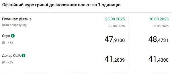 Национальный банк Украины (НБУ) повысил курс доллара к гривне. Европейская валюта также подорожала. Об этом сообщает РБК-Украина со ссылкой на данные на сайте регулятора. Официальный курс на 26 августа 2025 года установлен на таком уровне: 41,4300 гривен за 1 доллар (+0,1461 грн). Официальный курс евро составит 48,4731 гривен за 1 евро (+0,5631 грн).