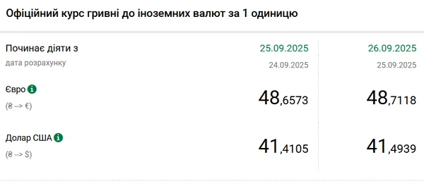 Национальный банк Украины (НБУ) повысил доллара к гривне. Доллар подорожал до максимума с середины августа. Об этом сообщает РБК-Украина со ссылкой на данные на сайте регулятора. Официальный курс на 26 сентября 2025 года установлен на таком уровне: 41,4939 гривен за 1 доллар (+0,0834 грн). Выше курс был 14 августа - 41,5149 грн/доллар. Официальный курс евро составит 48,7118 гривен за 1 евро (+0,0545 грн).