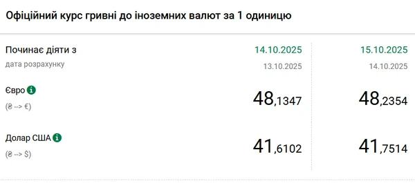 Национальный банк Украины (НБУ) повысил курс доллара к гривне. Доллар подорожал до максимума с начала августа. Об этом сообщает РБК-Украина со ссылкой на данные на сайте регулятора. Официальный курс на 15 октября 2025 года установлен на таком уровне: 41,7514 гривен за 1 доллар (+0,1412 грн). Выше был курс только 5 августа - 41,7901. Официальный курс евро составит 48,2354 гривен за 1 евро (+0,1007 грн).