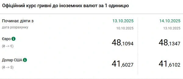 Национальный банк Украины (НБУ) повысил курс доллара к гривне. Доллар замедлил быстрый рост прошлой недели. Об этом сообщает РБК-Украина со ссылкой на данные на сайте регулятора. Официальный курс на 14 октября 2025 года установлен на таком уровне: 41,6102 гривен за 1 доллар (+0,0075 грн). Официальный курс евро составит 48,1347 гривен за 1 евро (+0,0253 грн).