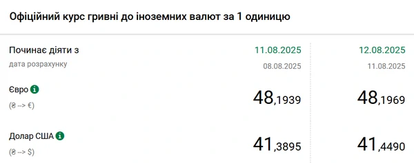 Национальный банк Украины (НБУ) повысил курс доллара к гривне. Регулятор впервые поднял курс после значительного снижения, которое началось 5 августа. Об этом сообщает РБК-Украина со ссылкой на данные на сайте регулятора. Официальный курс на 12 августа 2025 года установлен на таком уровне: 41,449 гривен за 1 доллар (+0,0595 грн). Официальный курс евро составляет 48,1969 гривен за 1 евро (+0,003 грн).