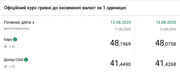 Национальный банк Украины (НБУ) снизил курс доллара к гривне, снижение произошло небольшое – на 2 копейки. Об этом сообщает РБК-Украина со ссылкой на данные на сайте регулятора. Официальный курс доллара на 13 августа 2025 года установлен на таком уровне: 41,4268 гривен за 1 доллар (-0,0222 грн). Официальный курс евро составляет 48,0758 гривен за 1 евро (+0,1211 грн).