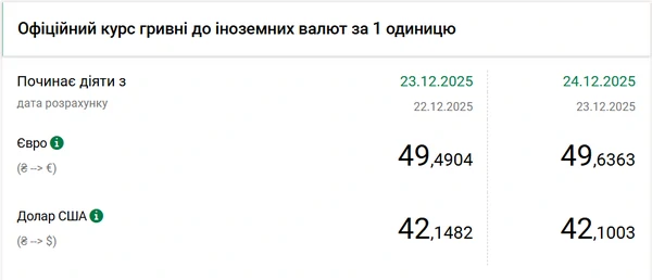 Национальный банк Украины (НБУ) снизил курс доллара к гривне — на 5 копеек. Об этом сообщает РБК-Украина со ссылкой на данные на сайте регулятора. Официальный курс доллара на 24 декабря 2025 года установлен на таком уровне: 42, 1003 гривен за 1 доллар (-0, 05 грн). Официальный курс евро составляет 49, 6363 гривен за 1 евро (+0, 15 грн).