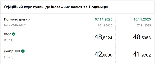 Национальный банк Украины (НБУ) понизил курс доллара к гривне – на 11 копеек. Об этом сообщает РБК-Украина со ссылкой на данные на сайте регулятора. Официальный курс доллара на 10 ноября 2025 года установлен на таком уровне: 41,9782 гривны за 1 доллар (-0,11 грн). С начала года курс года курс доллара понизился на 5 копеек. 1 января 2025 года американская валюта стоила 42,02 гривны. При этом с 1 ноября курс доллара практически не изменился. В начале месяца его стоимость также составляла 41,97 гривны. Официальный курс евро на 10 ноября составляет 48,5058 гривны. Единая европейская валюта также подешевела. По сравнению с 7 ноября ее стоимость снизилась на 2 копейки.