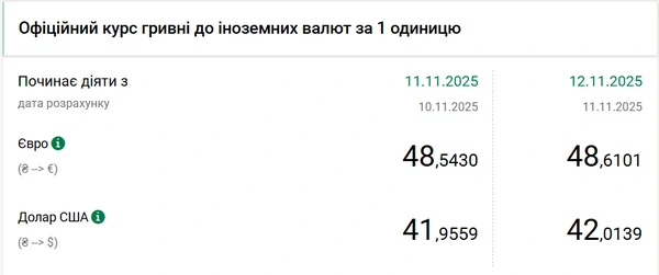 Национальный банк Украины (НБУ) повысил курс доллара к гривне. Валюта США подорожала на 6 копеек. Об этом сообщает РБК-Украина со ссылкой на данные на сайте регулятора. Официальный курс доллара на 12 ноября 2025 года установлен на таком уровне: 42,0139 гривны за 1 доллар (+0,06 грн). С начала года курс доллара понизился на 1 копейку. 1 января 2025 года американская валюта стоила 42,02 гривны. При этом с 1 ноября курс доллара стал больше на 4 копейки. В начале месяца его стоимость составляла 41,97 гривны. Официальный курс евро на 12 ноября составляет 48,6101 гривны. Единая европейская валюта также подорожала. По сравнению с 11 ноября ее стоимость увеличилась на 7 копеек.
