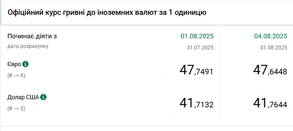 Национальный банк Украины (НБУ) повысил курс доллара к гривне. Единая европейская валюта снова подешевела. Об этом сообщает РБК-Украина со ссылкой на данные на сайте регулятора. Официальный курс на 4 августа 2025 года установлен на таком уровне: 41,7644 гривен за 1 доллар (+0,0512 грн). Официальный курс евро составит 47,6448 гривен за 1 евро (-0,1043 грн).
