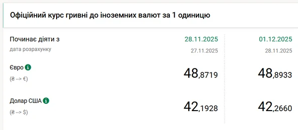 Национальный банк Украины (НБУ) повысил официальный курс доллара на 1 декабря. Американская валюта подорожала на 7 копеек. Об этом сообщает РБК-Украина со ссылкой на данные на сайте регулятора. Официальный курс доллара на 1 декабря 2025 года составляет 42,2660 гривны. На 28 ноября НБУ установил стоимость американской валюты на уровне 42,1928 гривны. С начала года доллар подорожал на 24 копейки: 1 января его курс был 42,02 гривны. За месяц рост курса валюты США составил 29 копеек. 1 ноября Национальный банк оценивал доллар в 41,97 гривны. Официальный курс евро на 1 декабря установлен на уровне 48,8933 гривны. Европейская валюта также укрепилась. По сравнению с 28 ноября ее стоимость возросла на 2 копейки.