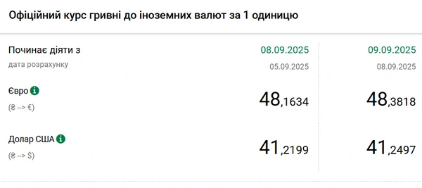 Национальный банк Украины (НБУ) повысил курс доллара к гривне. Единая европейская валюта также подорожала. Об этом сообщает РБК-Украина со ссылкой на данные на сайте регулятора. Официальный курс на 9 сентября 2025 года установлен на таком уровне: 41,2497 гривен за 1 доллар (+0,0298 грн). Официальный курс евро составит 48,3818 гривен за 1 евро (+0,2184 грн).