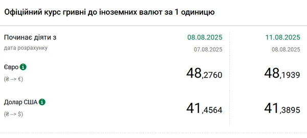 Национальный банк Украины (НБУ) снизил курс доллара к гривне. Доллар дешевеет четвертый день подряд и упал до минимума с середины апреля. Об этом сообщает РБК-Украина со ссылкой на данные на сайте регулятора. Официальный курс на 11 августа 2025 года установлен на таком уровне: 41,3895 гривен за 1 доллар (-0,0669 грн). Это минимальный уровень с 19 апреля (41,3825 гривен). Официальный курс евро составит 48,1939 гривен за 1 евро (-0,0821 грн).