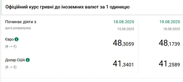 Национальный банк Украины (НБУ) снизил курс доллара к гривне. Доллар упал до минимума с начала апреля, когда курс был самым низким в этом году. Об этом сообщает РБК-Украина со ссылкой на данные на сайте регулятора. Официальный курс на 19 августа 2025 года установлен на таком уровне: 41,2589 гривен за 1 доллар (-0,0812 грн). Это минимальный уровень с 9 апреля (41,174 гривен). Официальный курс евро составит 48,1739 гривен за 1 евро (-0,1320 грн).