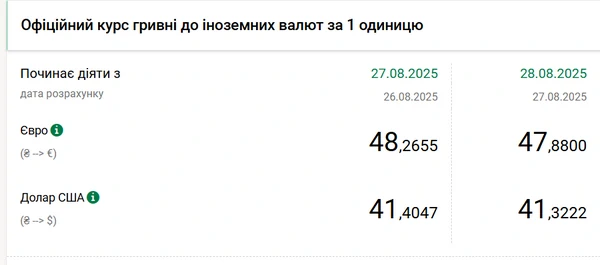 Национальный банк Украины (НБУ) снизил курс доллара к гривне. Европейская валюта также подешевела. Об этом сообщает РБК-Украина со ссылкой на данные на сайте регулятора. Официальный курс на 28 августа 2025 года установлен на таком уровне: 41,3222 гривен за 1 доллар (-0,0825 грн). Официальный курс евро составит 47,88 гривен за 1 евро (-0,3855 грн).