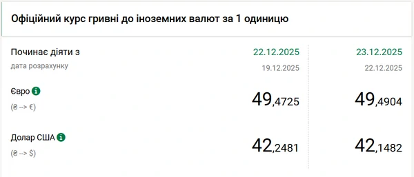 Национальный банк Украины (НБУ) снизил курс доллара к гривне — на 10 копеек. Об этом сообщает РБК-Украина со ссылкой на данные на сайте регулятора. Официальный курс доллара на 23 декабря 2025 года установлен на таком уровне: 42,1482 гривен за 1 доллар (-0,10 грн). Официальный курс евро составляет 49,4904 гривен за 1 евро (+0,02 грн).
