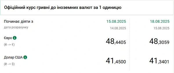 Национальный банк Украины (НБУ) немного снизил курс доллара к гривне – на 11 копеек. Об этом сообщает РБК-Украина со ссылкой на данные на сайте регулятора. Официальный курс доллара на 18 августа 2025 года установлен на таком уровне: 41,3401 гривен за 1 доллар (-0,1099 грн к курсу 41,45, который действует 15-17 августа). Официальный курс евро на 18 августа составляет 48,3059 гривен за 1 евро (-0,1346 грн).
