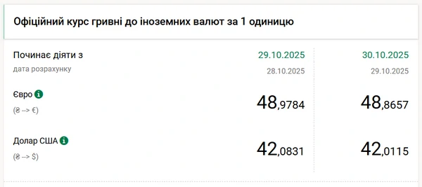 Национальный банк Украины (НБУ) понизил курс доллара к гривне – на 7 копеек. Об этом сообщает РБК-Украина со ссылкой на данные на сайте регулятора. Официальный курс доллара на 30 октября 2025 года установлен на таком уровне: 42,0115 гривны за 1 доллар (-0,07 грн). Официальный курс евро составляет 48,8657 гривны за 1 евро (-0,11 грн).
