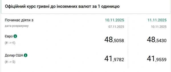 Национальный банк Украины (НБУ) понизил курс доллара к гривне. Валюта США подешевела на 2 копейки. Об этом сообщает РБК-Украина со ссылкой на данные на сайте регулятора. Официальный курс доллара на 11 ноября 2025 года установлен на таком уровне: 41,9559 гривны за 1 доллар (-0,02 грн). С начала года курс доллара понизился на 7 копеек. 1 января 2025 года американская валюта стоила 42,02 гривны. При этом с 1 ноября курс доллара стал меньше на 2 копейки. В начале месяца его стоимость составляла 41,97 гривны. Официальный курс евро на 11 ноября составляет 48,5430 гривны. В отличие от доллара единая европейская валюта подорожала. По сравнению с 10 ноября ее стоимость увеличилась на 4 копейки.