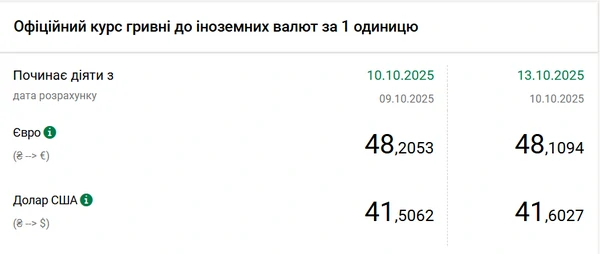 Национальный банк Украины (НБУ) повысил курс доллара к гривне – на 10 копеек. Об этом сообщает РБК-Украина со ссылкой на данные на сайте регулятора. Официальный курс доллара на 13 октября 2025 года установлен на таком уровне: 41,6027 гривен за 1 доллар (+0,10 грн). Официальный курс евро составляет 48,1094 гривен за 1 евро (-0,10 грн).