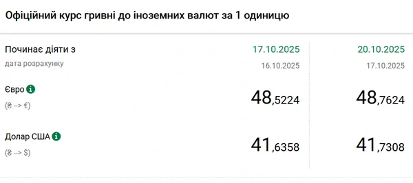 Национальный банк Украины (НБУ) повысил курс доллара к гривне. Доллар подорожал после снижения накануне. Об этом сообщает РБК-Украина со ссылкой на данные на сайте регулятора. Официальный курс на 20 октября 2025 года установлен на таком уровне: 41,7308 гривен за 1 доллар (+0,0950 грн). Официальный курс евро составит 48,7624 гривен за 1 евро (+0,2400 грн).
