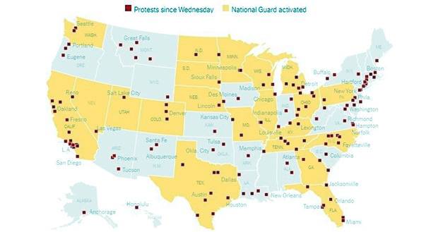 Массовые протесты охватили уже почти полторы сотни американских городов. Власти все больше привлекают военных.