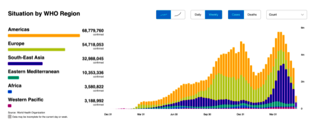 По данным Всемирной организации здравоохранения (ВОЗ), в странах мира за минувшую неделю заболеваемость коронавирусом снизилась на 15%, а смертность – на 8%. Об этом сообщает DW.За минувшую неделю в мире зарегистрировано более 3 млн новых случаев коронавируса и более 73 000 смертей. Самый большой прирост заболеваемости был выявлен в Индии (свыше 914 000 случаев за неделю). С начала распространения COVID-19 инфекция была выявлена у более чем 175 млн жителей планеты. Почти 3,8 млн заболевших скончались, более 158 млн человек выздоровели. | |